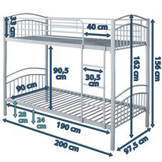 Das Bett ist bei Bedarf teilbar in zwei Einzelbetten und verfügt über eine fest anschraubbare Leiter sowie Fallschutzgitter. Die Metallbetten sind leicht zu reinigen, sehr stabil und dabei trotzdem einfach und schnell montiert. Sie bieten den Standard-Matratzen in einer Größe von 90 x 190 cm Platz. Jedes Bett kann bis zu 180 kg belastet werden.