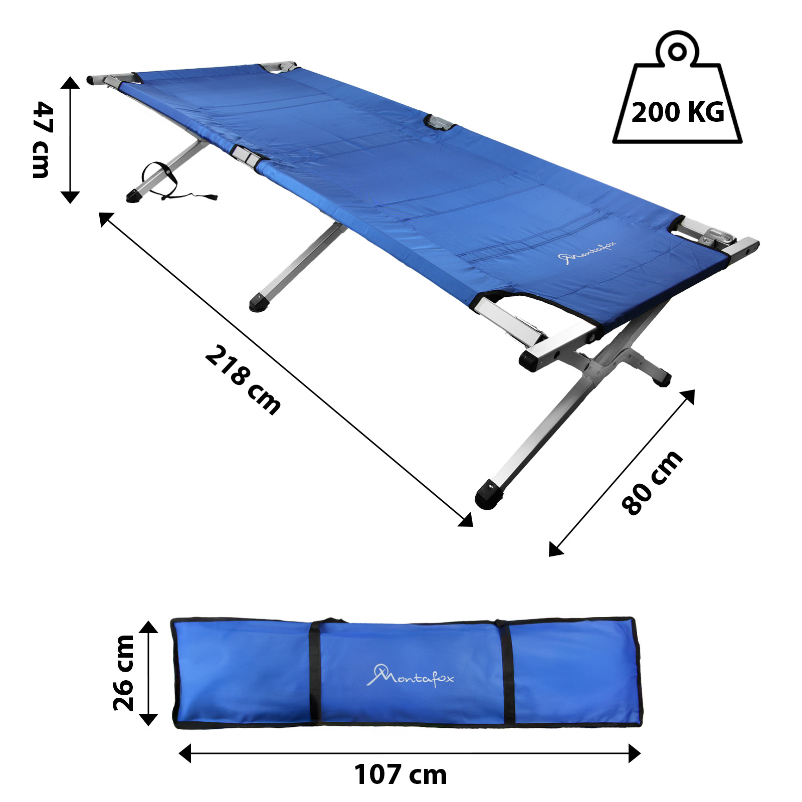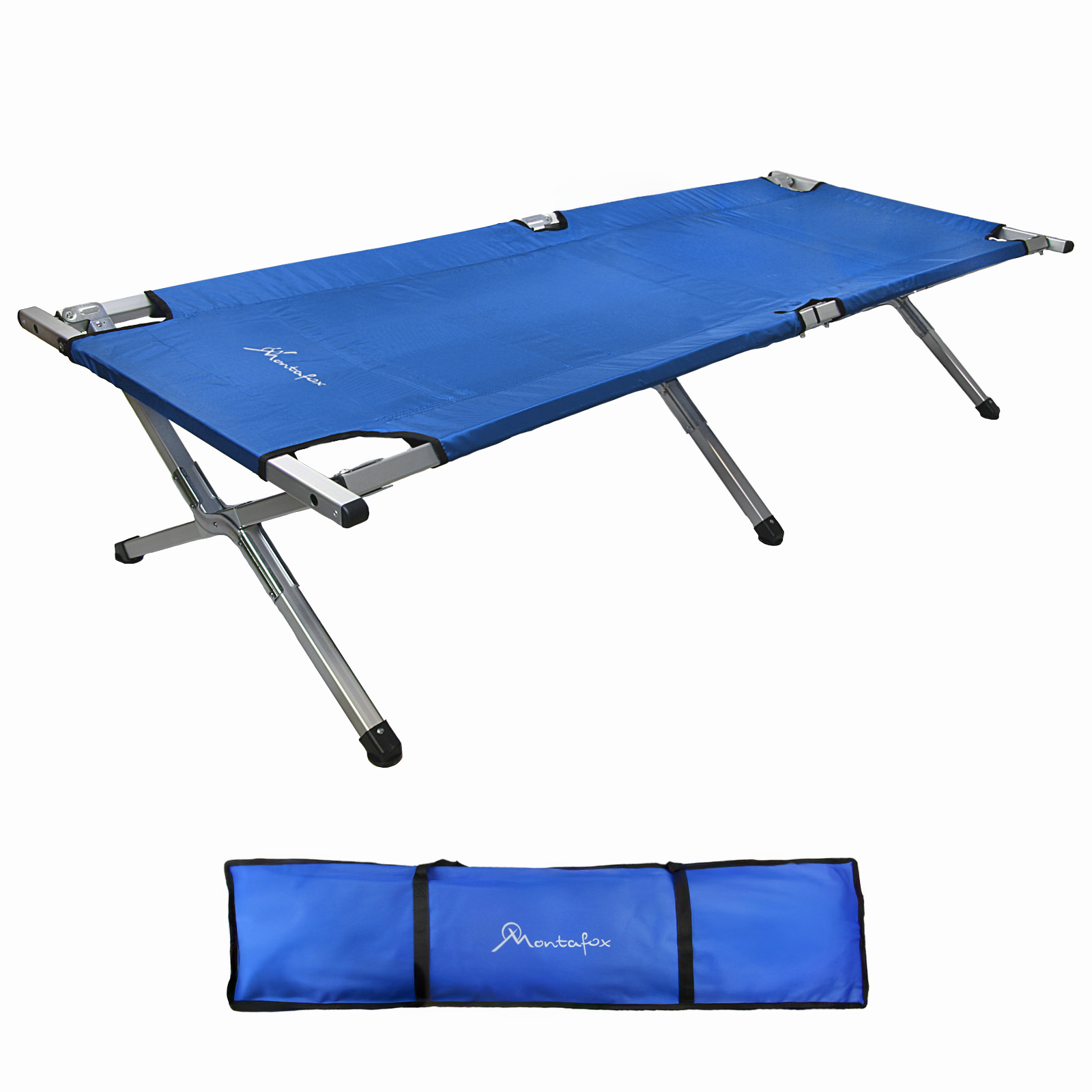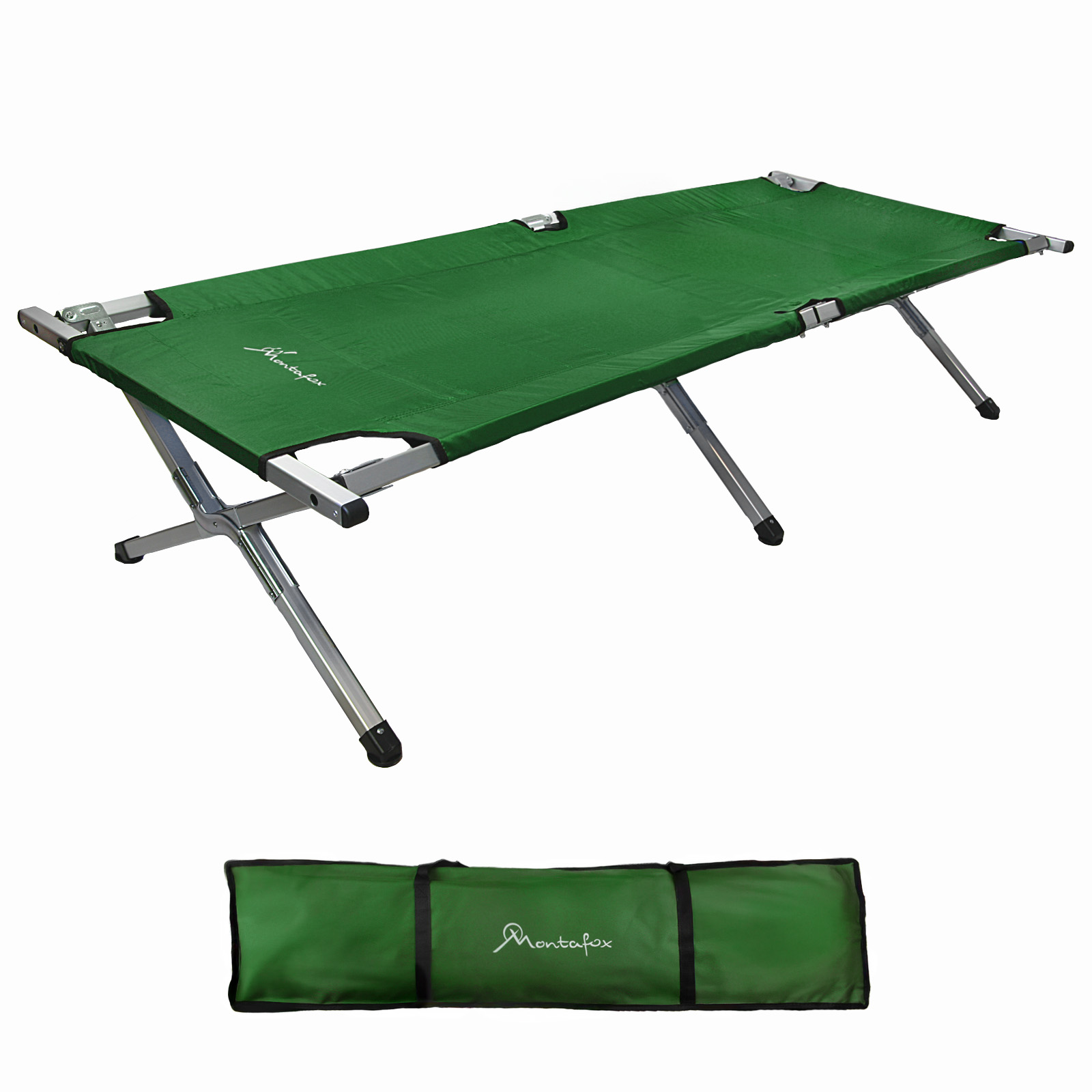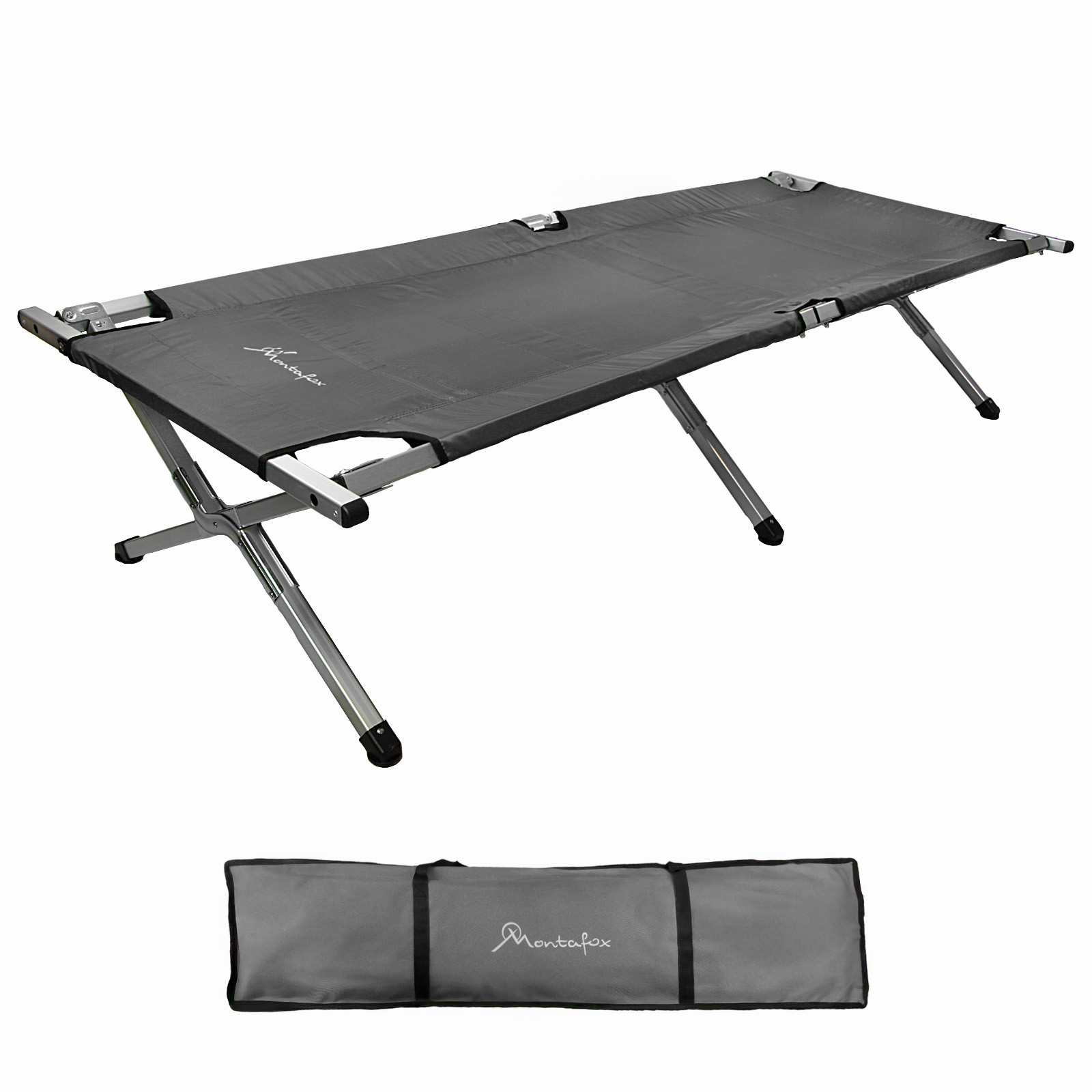 Fest vernähte Fixierbänder erlauben ein einfaches und kompaktes Zusammenklappen sowie sicheres Verschnüren des Feldbetts. Eine widerstandsfähige Tragetasche ist im Lieferumfang enthalten, die den Transport und die Lagerung der Feldbetten wesentlich erleichtert.