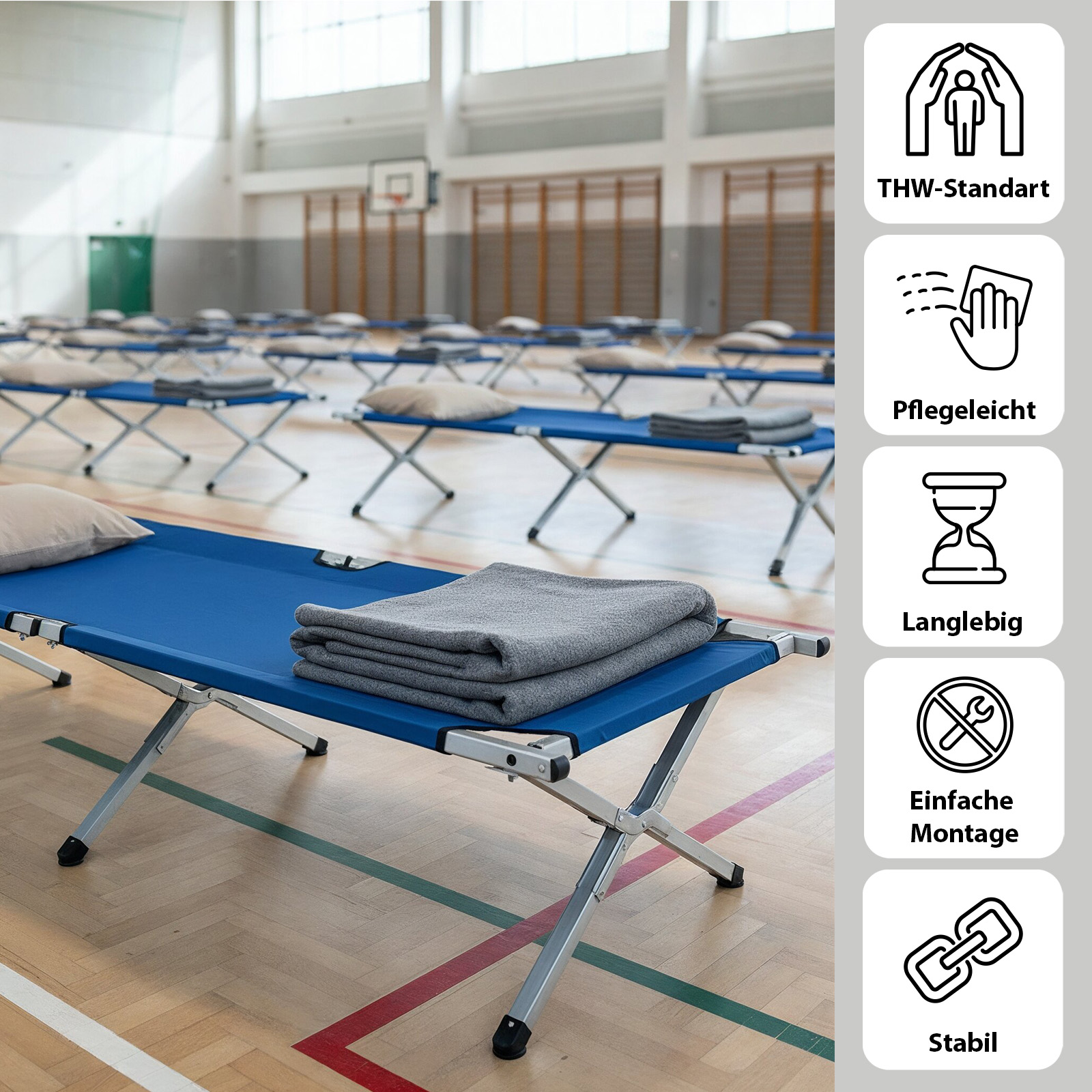 Das Profi-Feldbett wurde nach den Anforderungen des THW entwickelt und entspricht den Anforderungen der Technischen Lieferbedingungen der Bundeswehr.