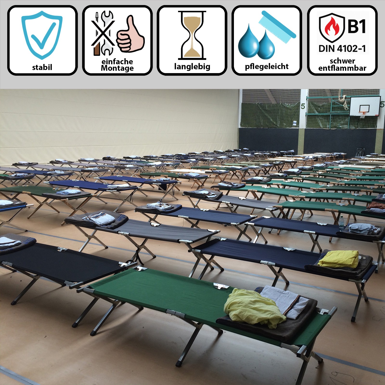 Dieses XXL-Feldbett wurde speziell für den Einsatz in Gemeinschaftsunterkünften, Notunterkünften, Erstaufnahmeeinrichtungen, Camps und Katastrophenschutz entwickelt. Mit geprüftem Brandschutz nach DIN 4102-1 (Baustoffklasse B1), einer besonders großen Liegefläche und einer Belastbarkeit von bis zu 200 kg ist es optimal für intensive, dauerhafte Nutzung ausgelegt.