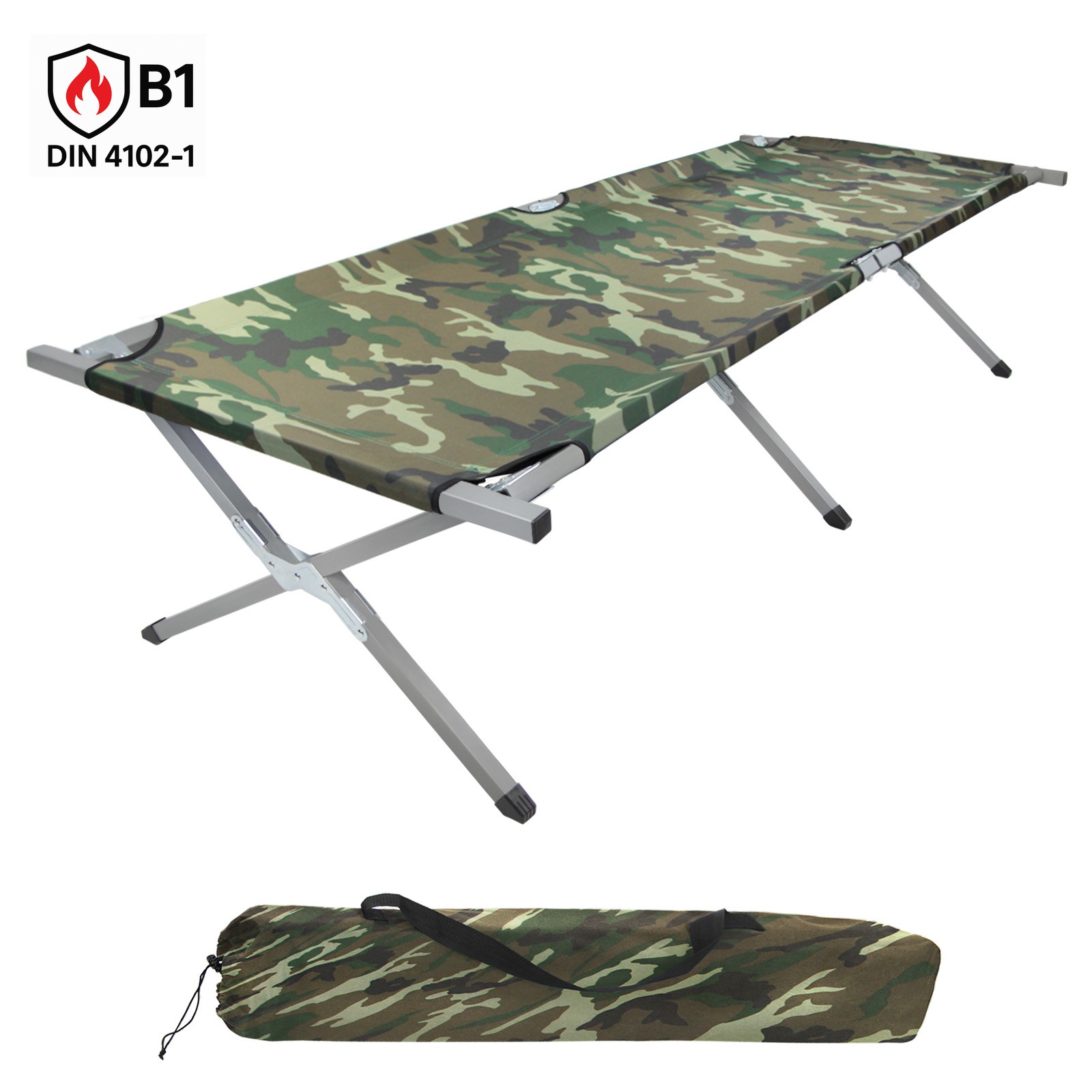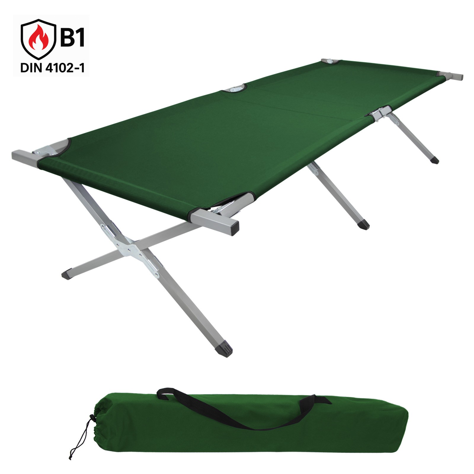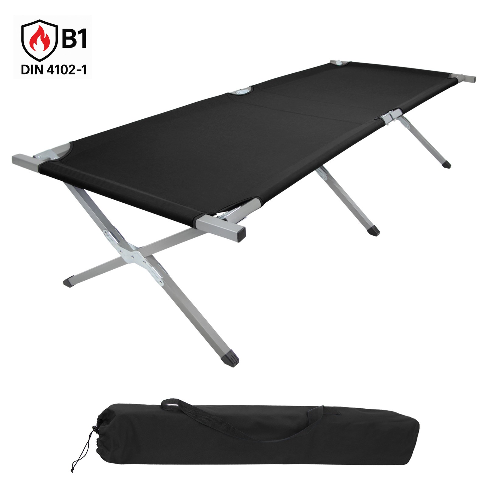 XXL Feldbett 210 x 72 x 45 cm – schwer entflammbar nach DIN 4102-1 (B1), bis 200 kg belastbar, robust & langlebig